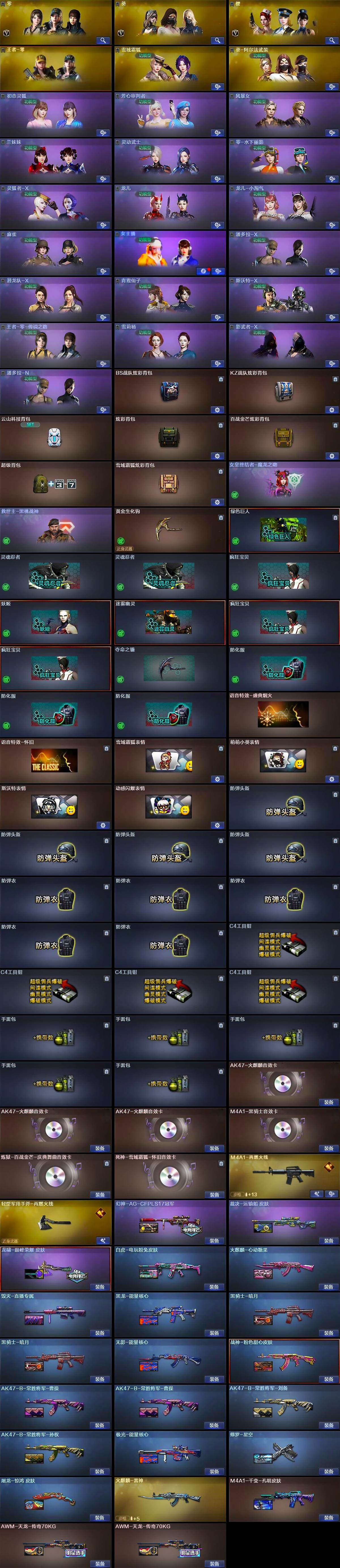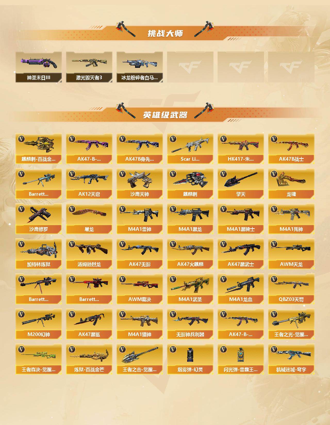 【热门武器】:Scar Light-白虎,HK417-朱雀,M200-幻神,死亡之眼,M4A1-黑骑士*2,汤姆逊-烈龙*6,加特林-炼狱,斯泰尔-蝴蝶,沙鹰-修罗*5