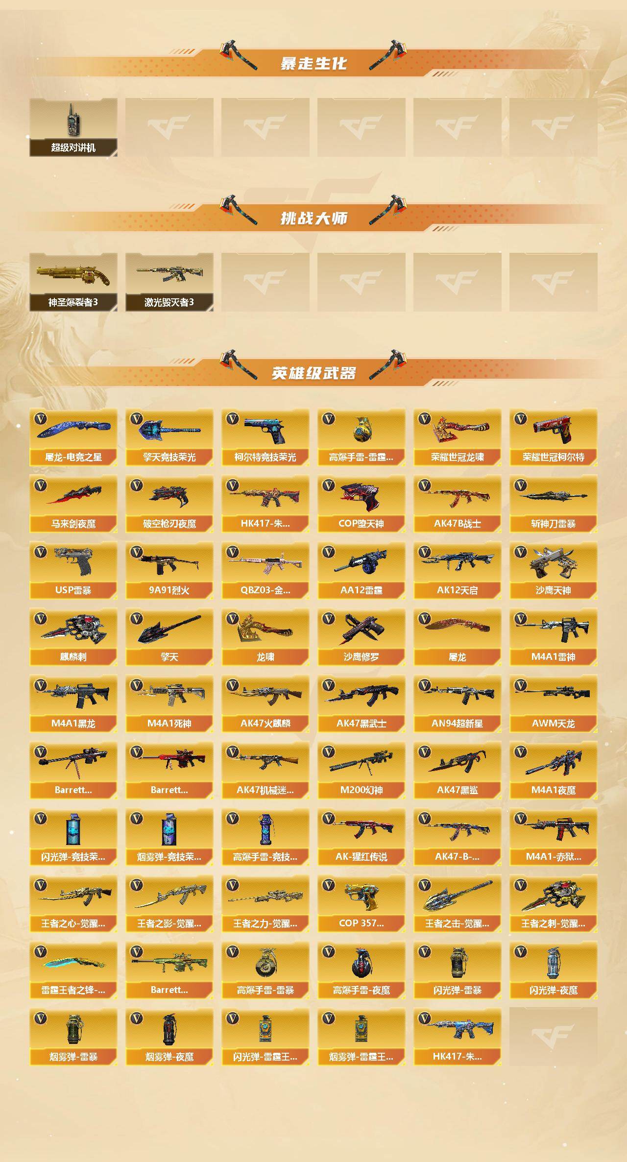 【热门武器】:QBZ03-金色蔷薇,HK417-朱雀,M200-幻神,荣耀世冠-柯尔特,斯泰尔-蝴蝶,火麒麟-绝迹,USP-雷暴,COP-堕天神*2,沙鹰-修罗*3,荣耀世冠-龙啸,黄金猫猫手套-白鲨