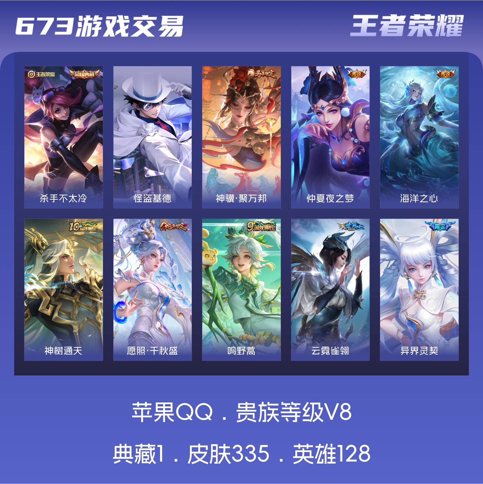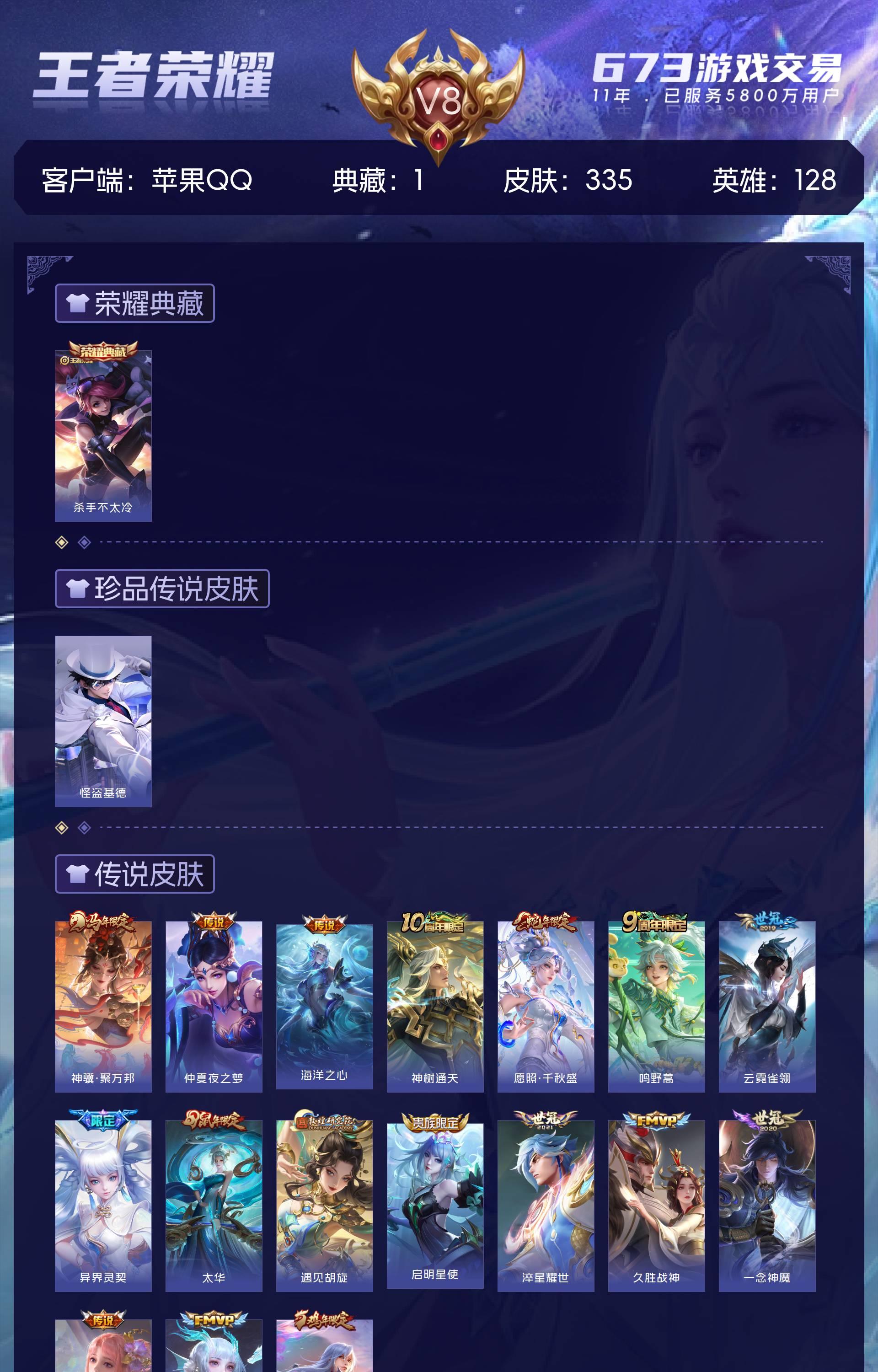 V8 皮肤335 英雄128 至尊星耀 荣耀典藏1 珍品传说1 传说18