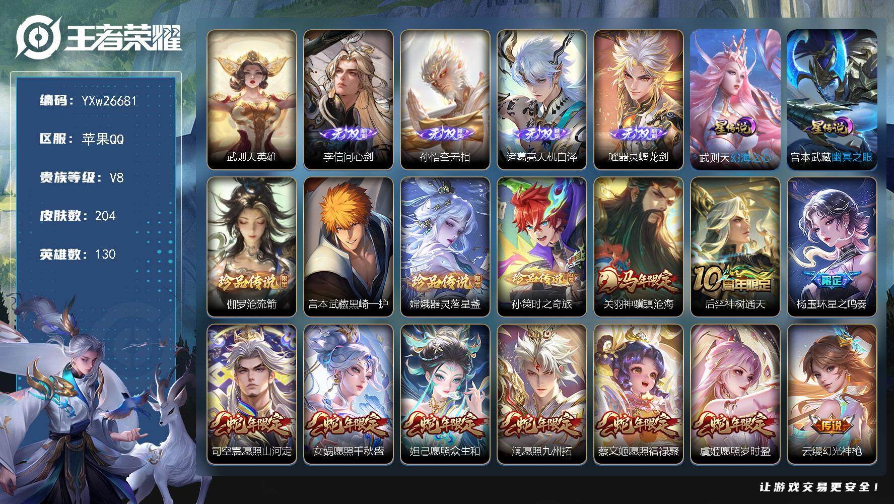 【高性价比·21传·全套蛇年·问心剑·无相·天机白泽·器灵螭龙剑·武则天英雄·沧流箭·黑崎一护·器灵落星盏·孙策时之奇旅·幻海之心·海洋之心·冰霜神祇·深海之息·至尊宝·可二次】YXw26681-苹果Q-130英雄-204皮肤-6王者印记-140铭文-贵族积分6w【贵族8】【1典藏·4无双·2星传说·21传说·16按键】【因赛季更新游戏段付以上号为准!】