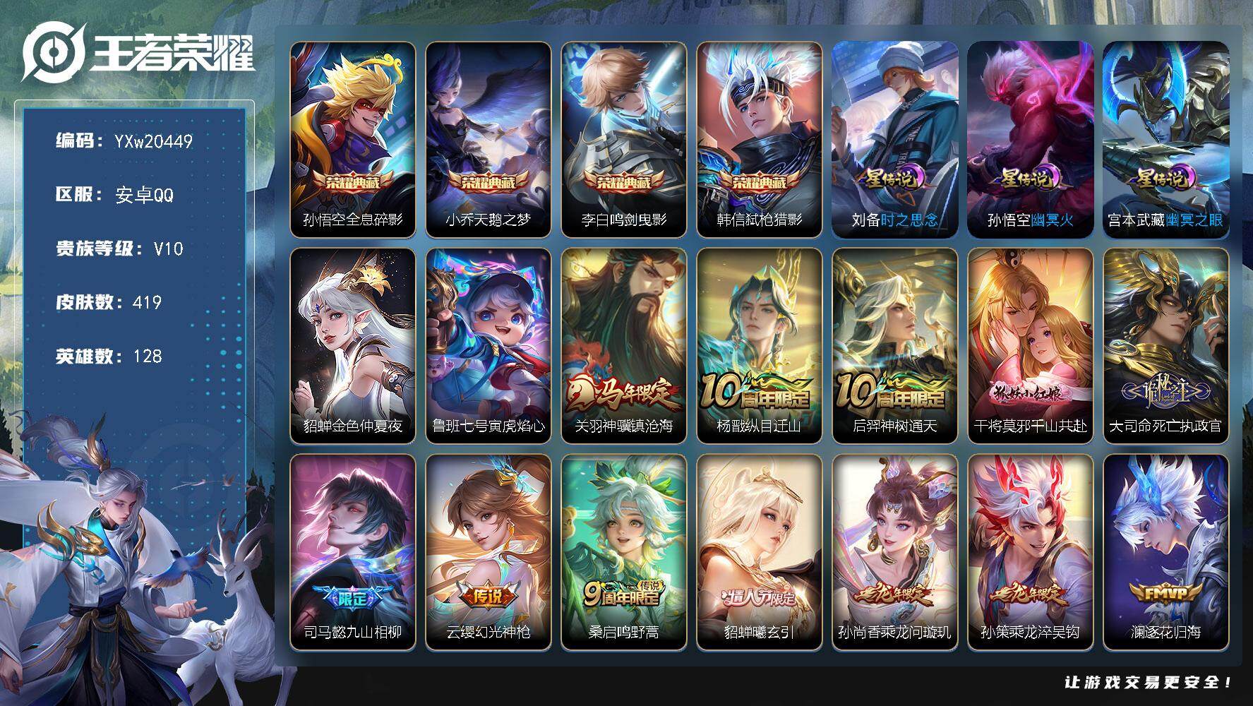 【精品V10推荐·弑枪猎影·天鹅之梦·全息碎影·鸣剑曳影·金色仲夏夜·寅虎焰心·神骥镇沧海·寅虎赤拳·乘龙淬吴钩·深海之息·不羡仙天幕·可二次】YXw20449-安卓Q-128英雄-419皮肤-10王者印记-300铭文-贵族积分21w【贵族10】【4典藏·5星传说·57传说·1天幕·39按键·239个性戳戳·229幸运值】【因赛季更新游戏段付以上号为准!】