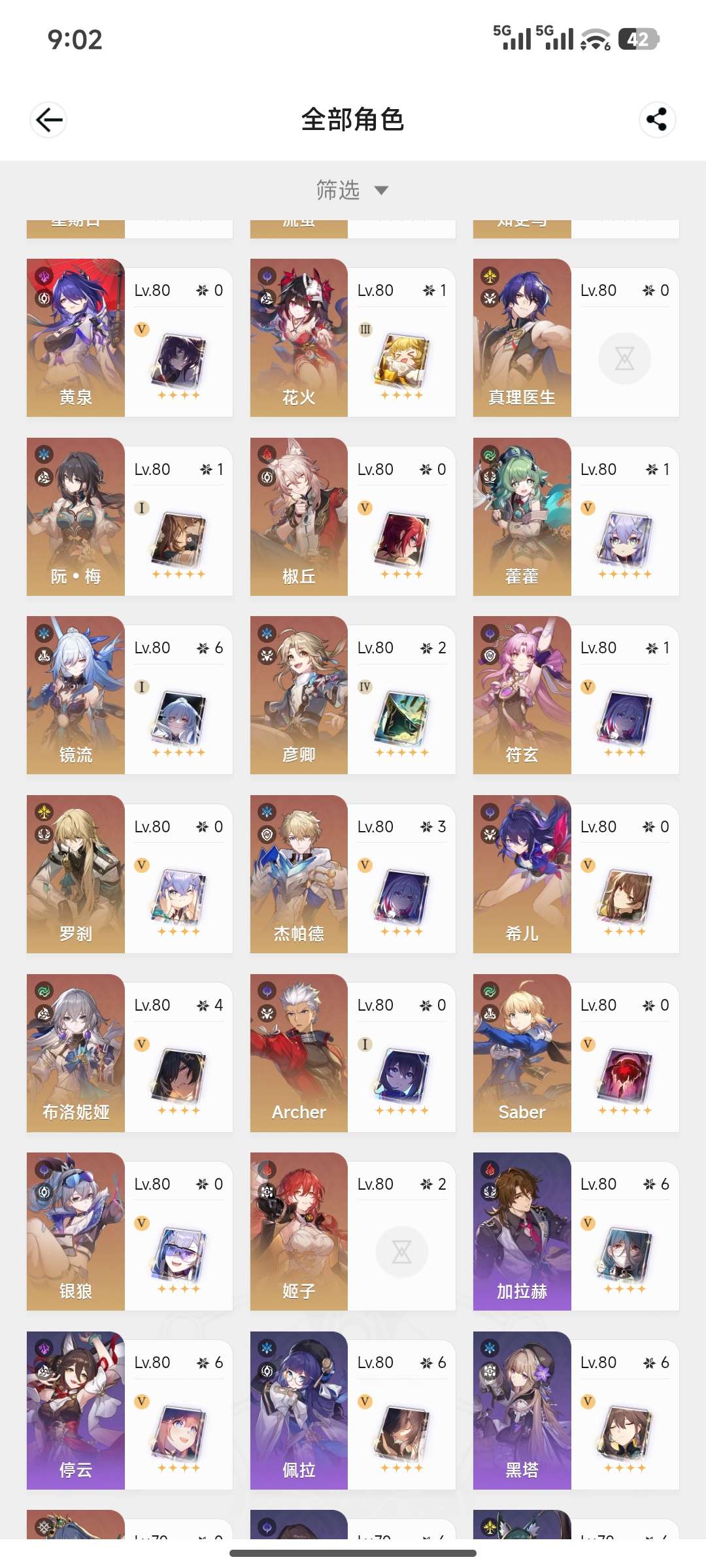 完全体记忆队齐全,满命镜流配队齐全,还有21狼尊,深渊全满没摆烂过,面板全部大毕业,可小刀
