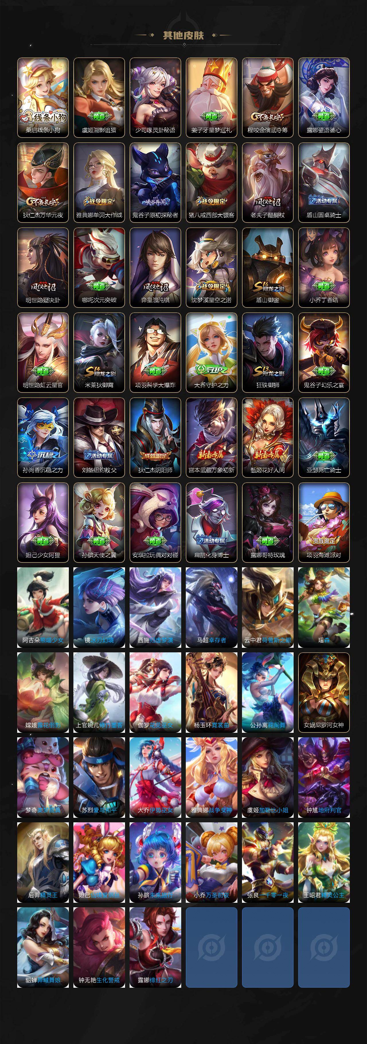 【限定皮肤】:狄仁杰阴阳师,赵云皇家上将,妲己时之彼端,马可波罗暗影游猎,狄仁杰魔术师,狄仁杰万华元夜,项羽海滩派对,老夫子醍醐杖,程咬金演武夺筹,露娜一生所爱,王昭君凤凰于飞,花木兰