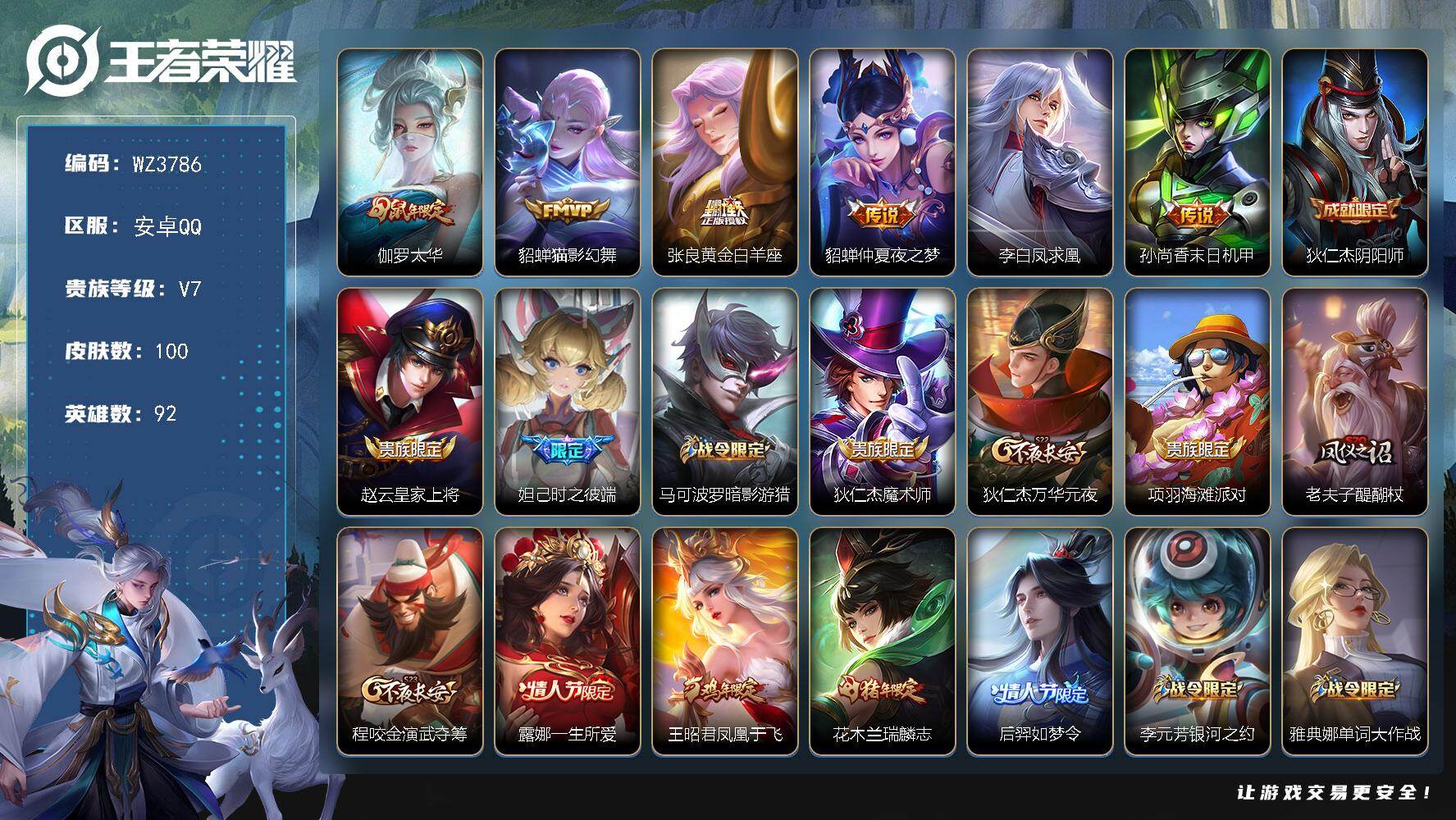 【秒换绑】安卓Q-V7-荣耀黄金III段位-92英雄-100皮肤-6传说-30史诗