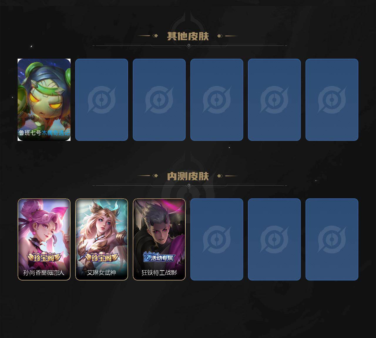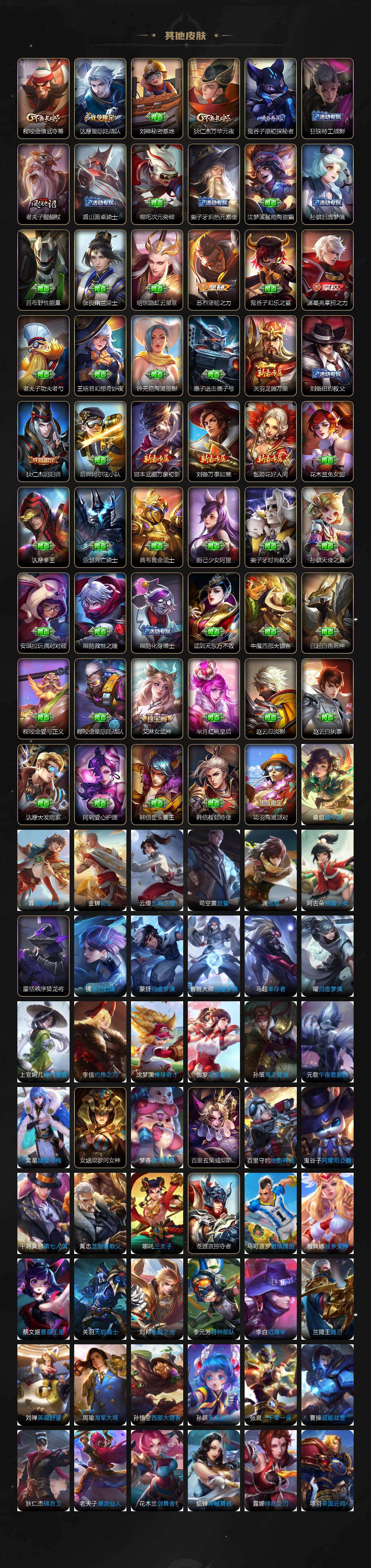 【传说皮肤】:后羿神树通天,司空震愿照山河定,女娲愿照千秋盛,桑启鸣野蒿,澜逐花归海,李元芳飞鸢探春,铠绛天战甲,镜炽阳神光,李信