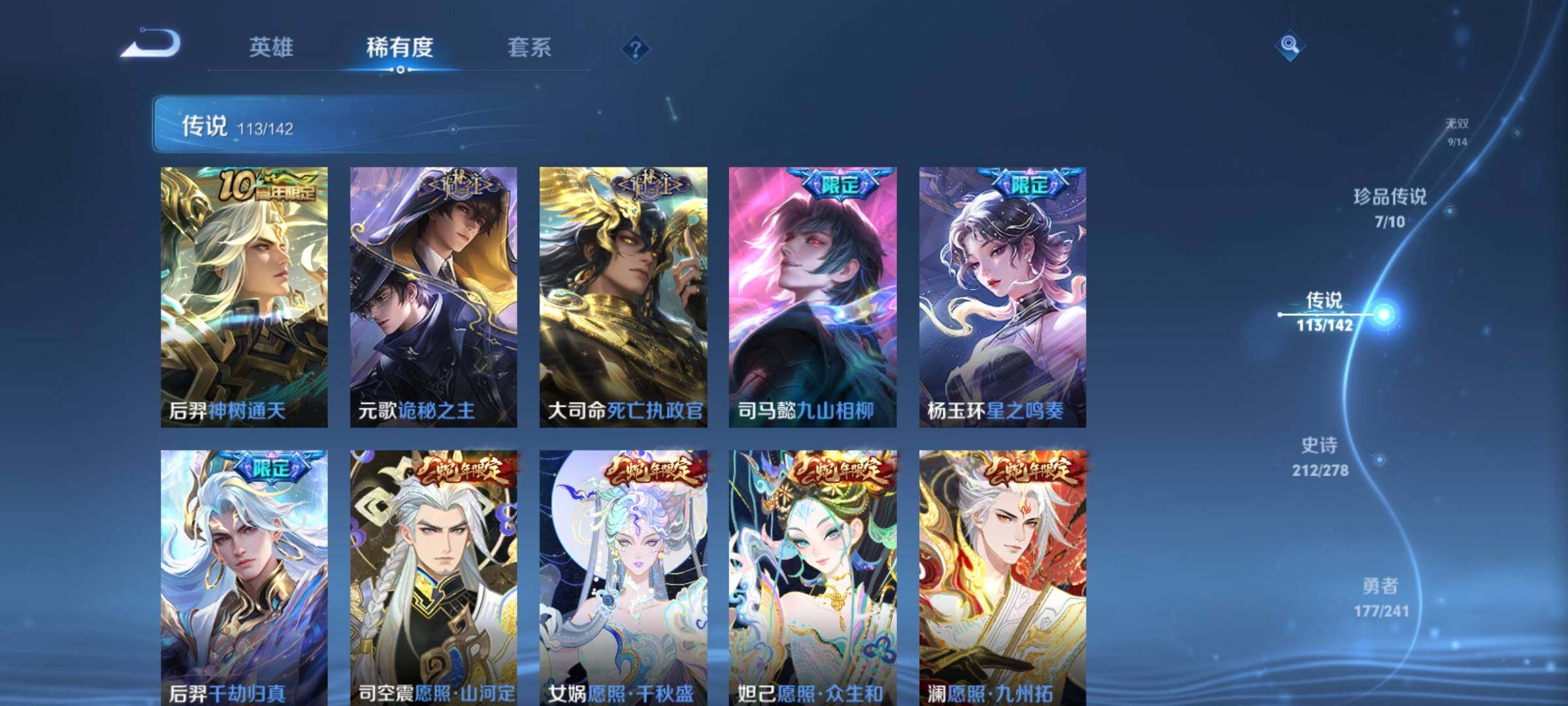 【推荐极品高质量600皮v10号·9无双·5典藏·7珍品·113传说·蛇年全套·龙年全套·多高质量限定传说皮·紫瑶·1典藏小兵·灵宝亲密度6.2w·贵族积分52.6w】·81按键,4星传说,4天幕,1小兵,881戳戳,5王者印记,满级铭文,可二次,安卓WX-V10-602皮肤-4典藏皮肤-1典藏英雄-9无双-7珍品传说-113传说-211史诗【英雄全皮】:嬴政全皮