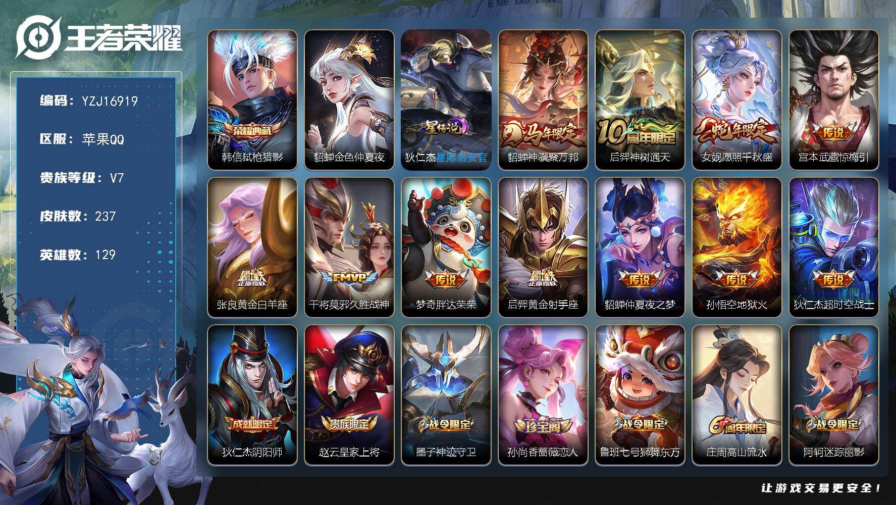 _无二次-苹果Q-V7-237皮肤1典藏11传说2星传说,,【星传说】星际治安官,金色仲夏夜【典藏】,弑枪猎影,【传说】,惊梅引,神骥聚万邦,神树通天,愿照千秋盛,地狱火,久胜战神,黄金射手座,黄金白羊座,超时空战士男,胖达荣荣,仲夏夜之梦,【热门】万灵启世,巫礼祀神,涂山容容,逐梦之光,逐霄之志,傲雪梅枪,拒霜思,匿光追影者,孙行者,神迹守卫钟馗,狮舞东方,朔望之晖,冰冠公主,暗影游猎,黎明之约