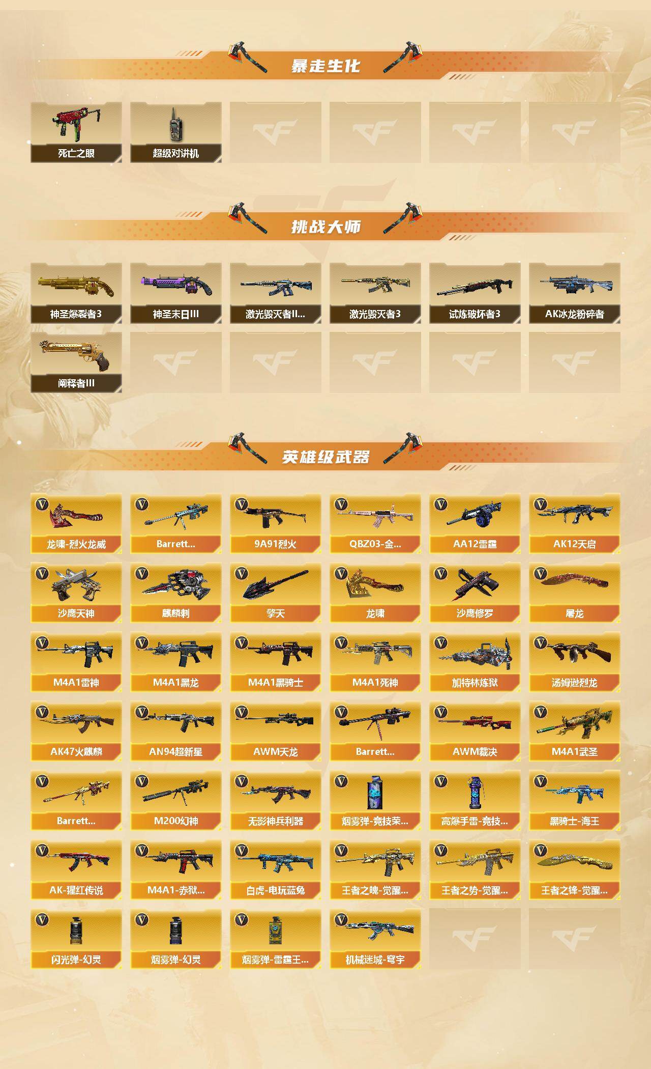 【热门武器】:QBZ03-金色蔷薇,M200-幻神,死亡之眼,白虎-电玩蓝兔,M4A1-黑骑士,汤姆逊-烈龙,加特林-炼狱,毁灭-孙三炮,沙鹰-修罗*2,Knife-冠军之刃