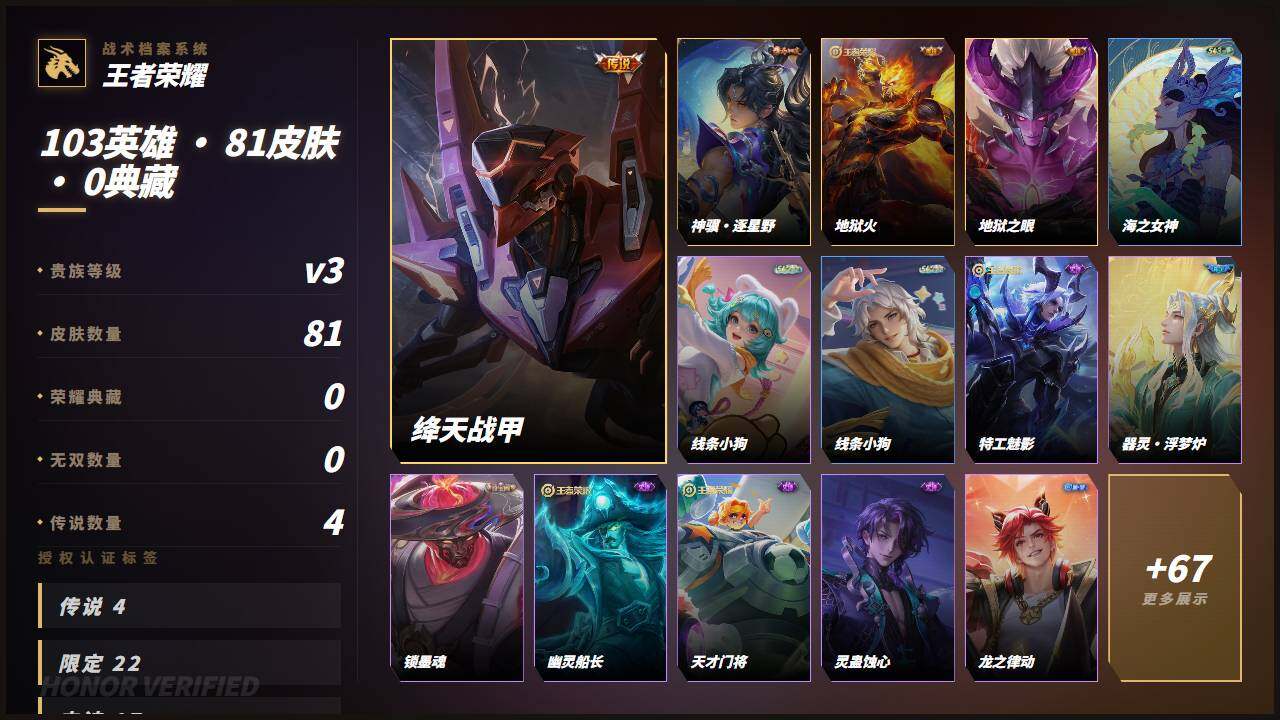 【16777400】贵族等级3/传说皮肤数量4/史诗皮肤数量17/皮肤数量81