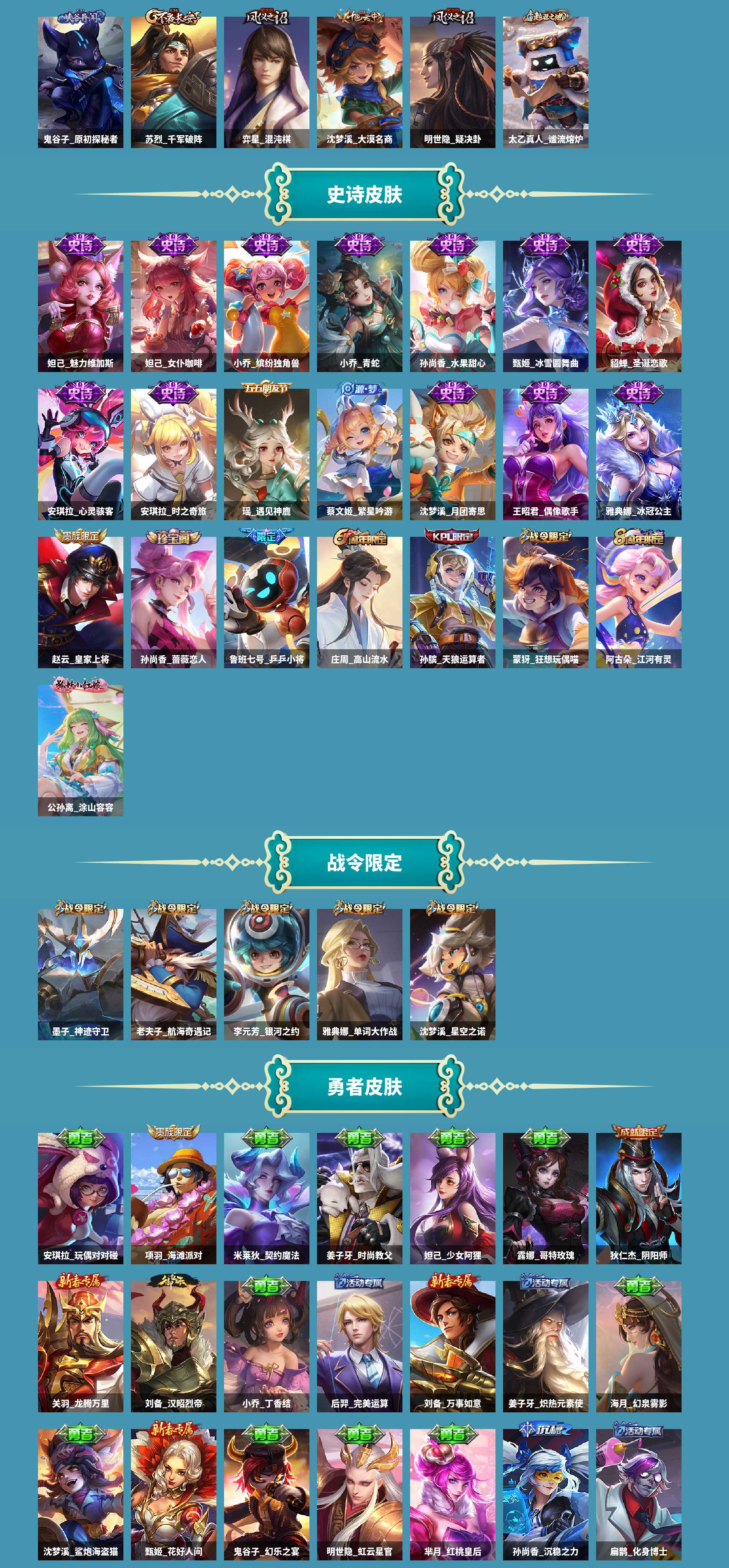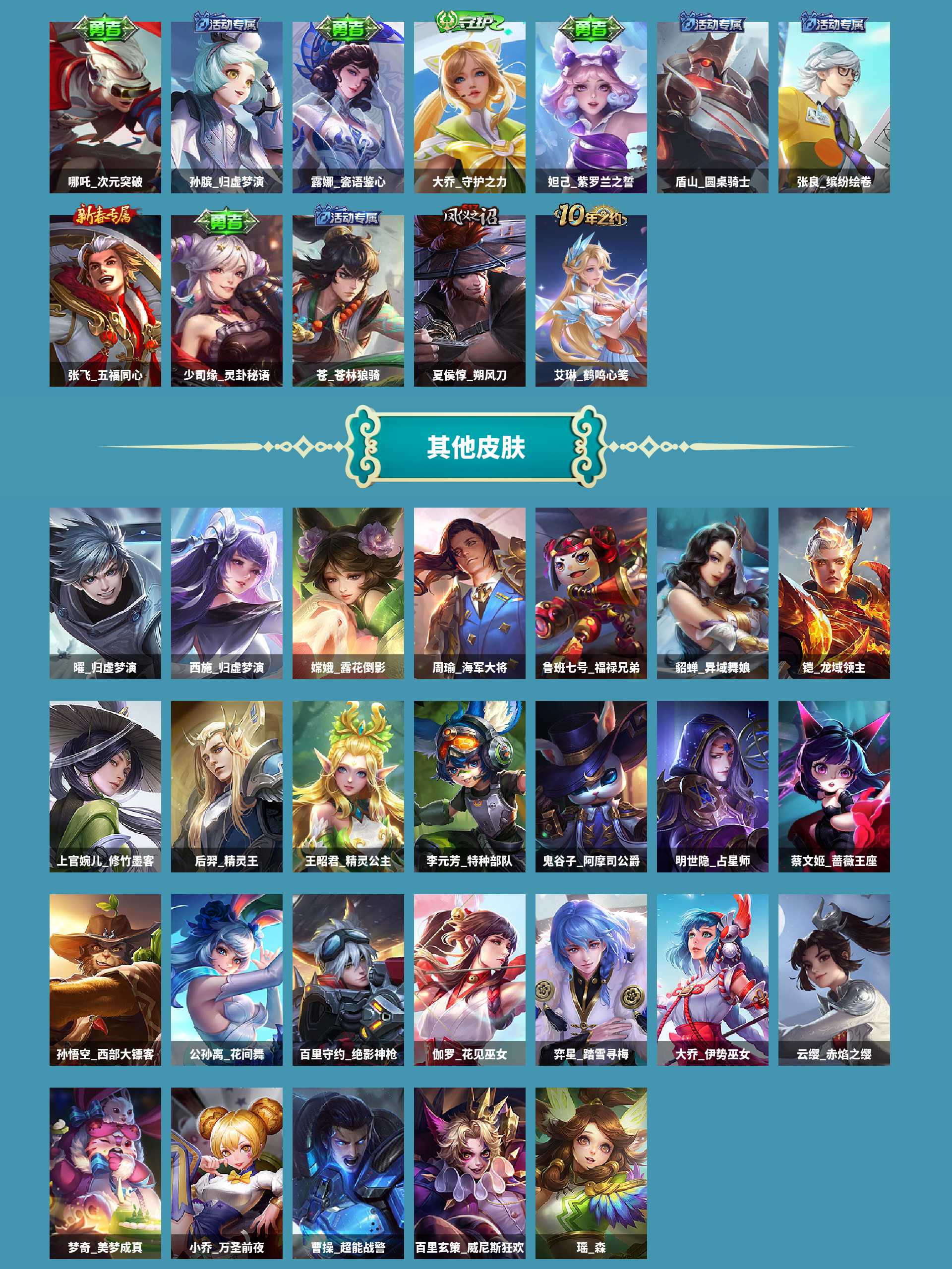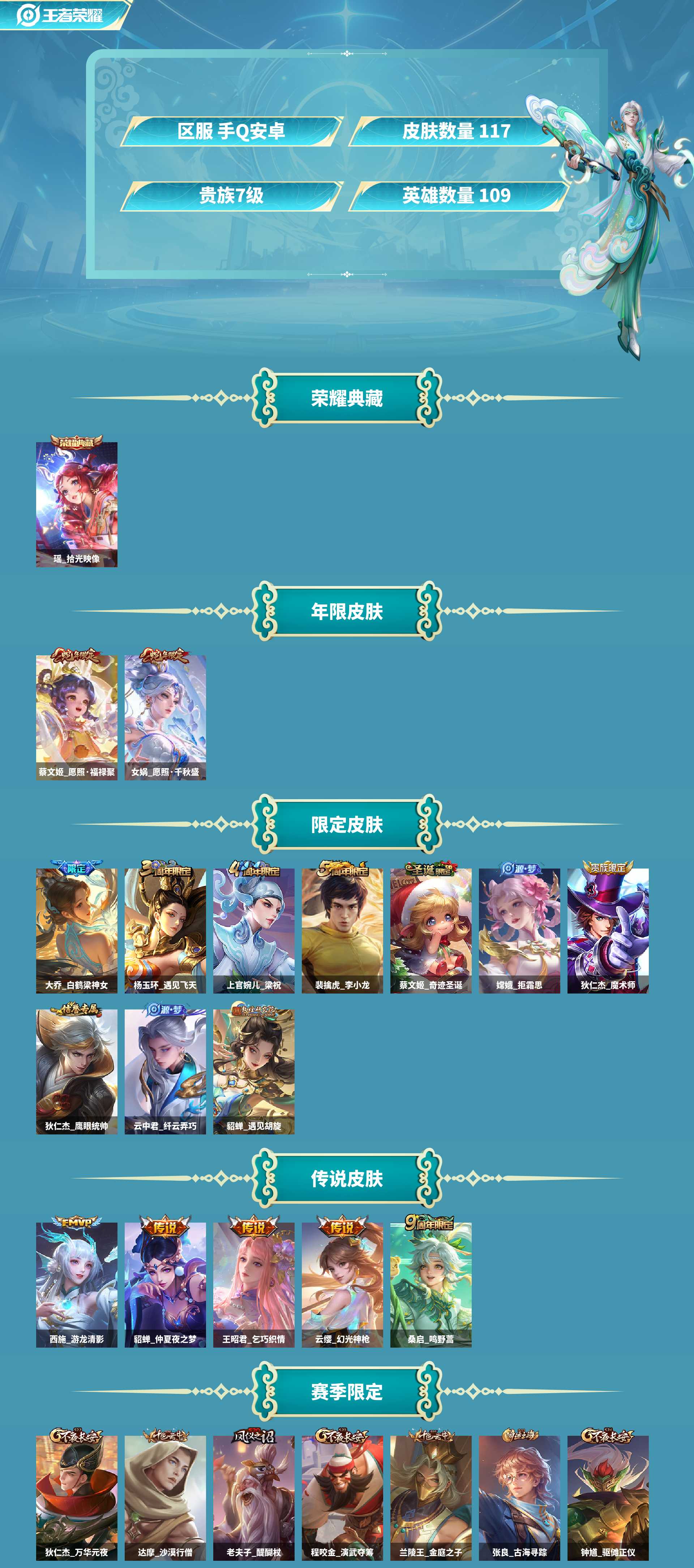 AL 【116皮 1典藏 8传说-女号连体三角洲嗨爪套】 皮肤数117 英雄数109 营地id 贵族等级【文本】贵族7级 【贵族7级】 【是】 荣耀典藏1 内测皮肤1 年限皮肤2 限定皮肤43 赛季限定14 史诗皮肤33 战令限定6 勇者皮肤49 其他皮肤26 荣耀典藏:瑶拾光映像; 内测皮肤:孙尚香蔷薇恋人; 年限皮肤:女娲愿照千秋盛,蔡文姬愿照福禄聚; 限定皮肤