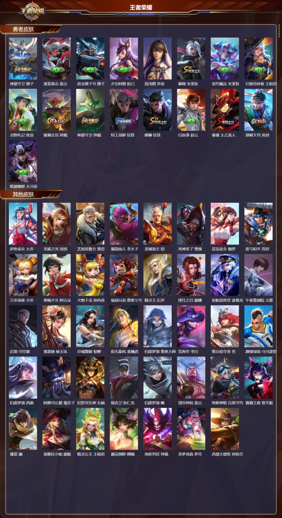 【19 传说皮肤】胖达荣荣 梦奇,启明星使 虞姬,零号·赤焰 孙悟空,地狱火 孙悟空,游龙清影 西施,仲夏夜之梦 貂蝉,祈雪灵祝 公孙离,默契交锋 兰陵王,黄金射手座 后羿,乘龙·问璇玑 孙尚香,时之恋人 刘备,末日机甲 孙尚香,
