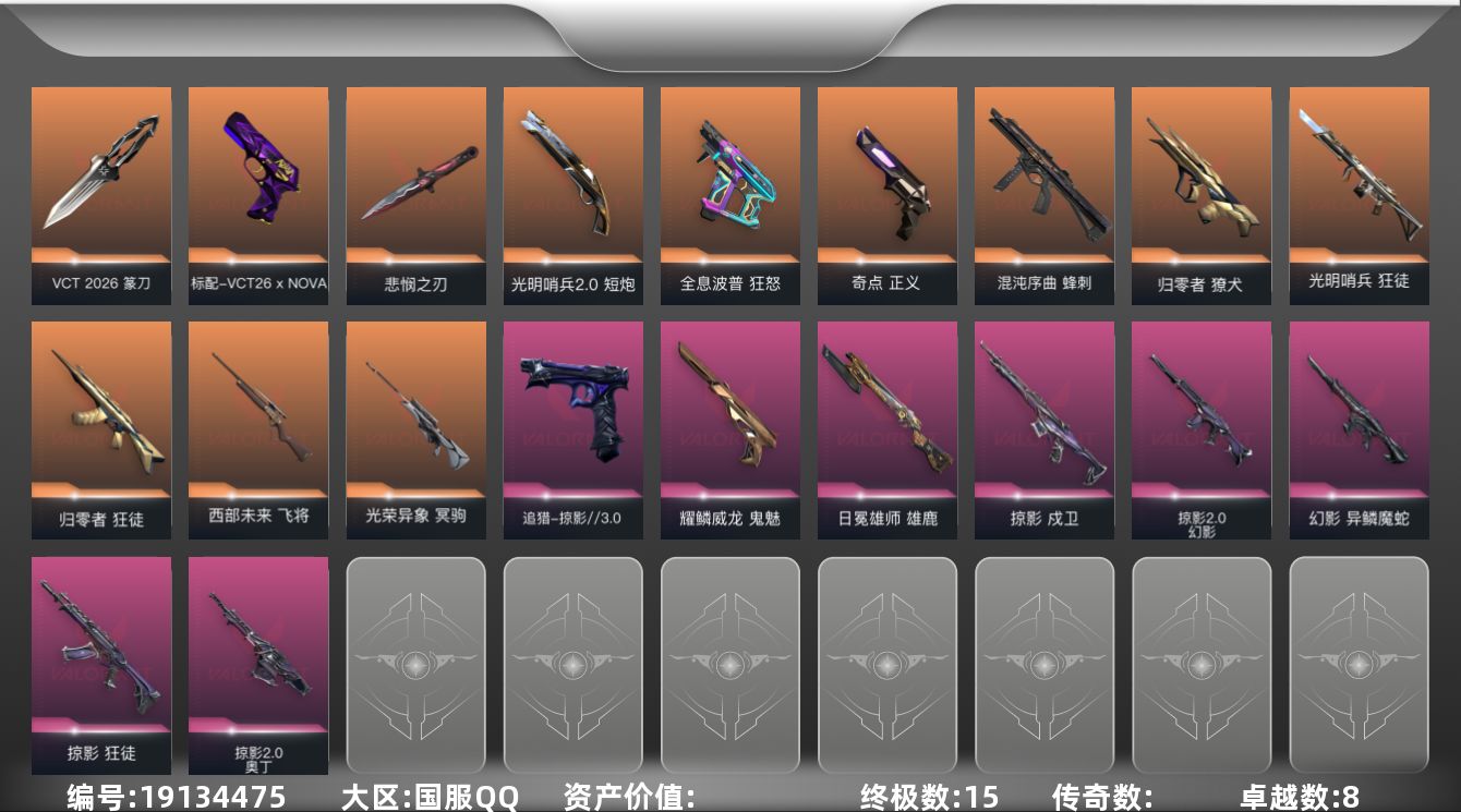 【套装】:VCT 2026 赛季套装,无畏契约季前邀请赛套装,回火礼包:掠影套装,掠影//3.0套装【英雄】:幻棱,炼狱,暮蝶,钛狐,壹决,铁臂,捷风,幽影,不死鸟,贤者,猎枭,蝰蛇,芮娜,奇乐,尚勃勒,斯凯,夜露,星礈,盖可【近战武器】:近战武器-蒙太奇 战斧,近战武器-VCT 2026 篆刀,近战武器-影蝶,近战武器-无畏契约季前邀请赛 悲悯之刃【狂徒】:狂徒-光明哨兵,狂徒-归零者,狂徒-掠影【幻影】:幻影-异鳞魔蛇,幻影-掠影//2.0,幻影-蒙太奇【戍卫】:戍卫-掠影【獠犬】:獠犬-归