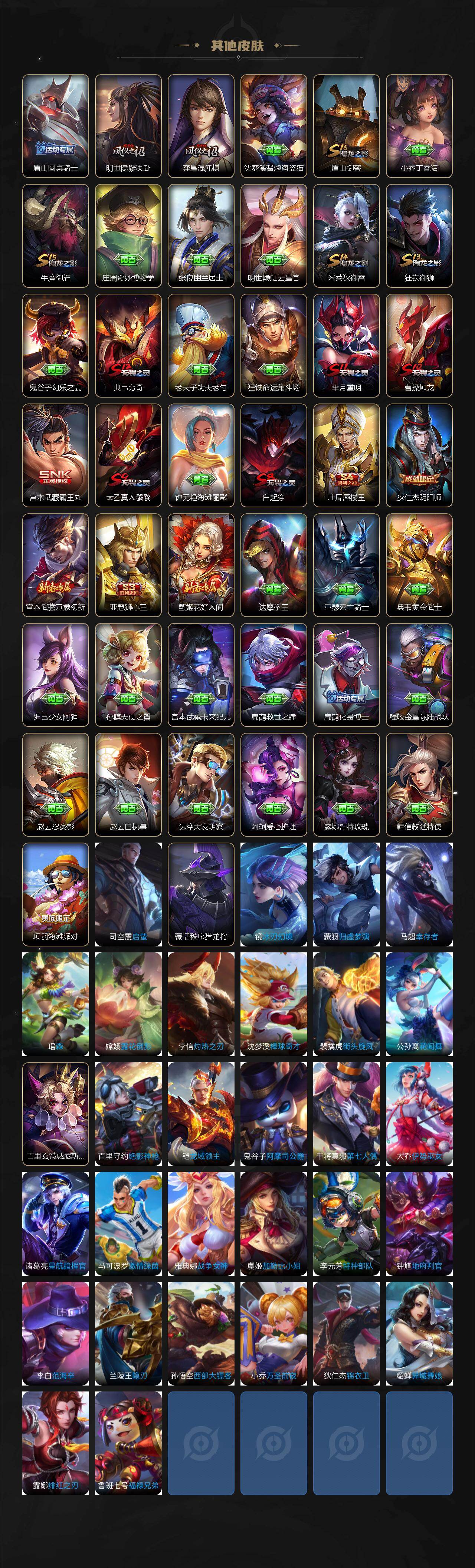 【限定皮肤】:白起狰,狄仁杰阴阳师,赵云皇家上将,庄周蜃楼王,芈月重明,曹操烛龙,典韦穷奇,狄仁杰魔术师,狄仁杰万华元夜,项羽海滩派对,老夫子醍醐杖,程咬金演武夺筹,露娜一生所爱,亚瑟