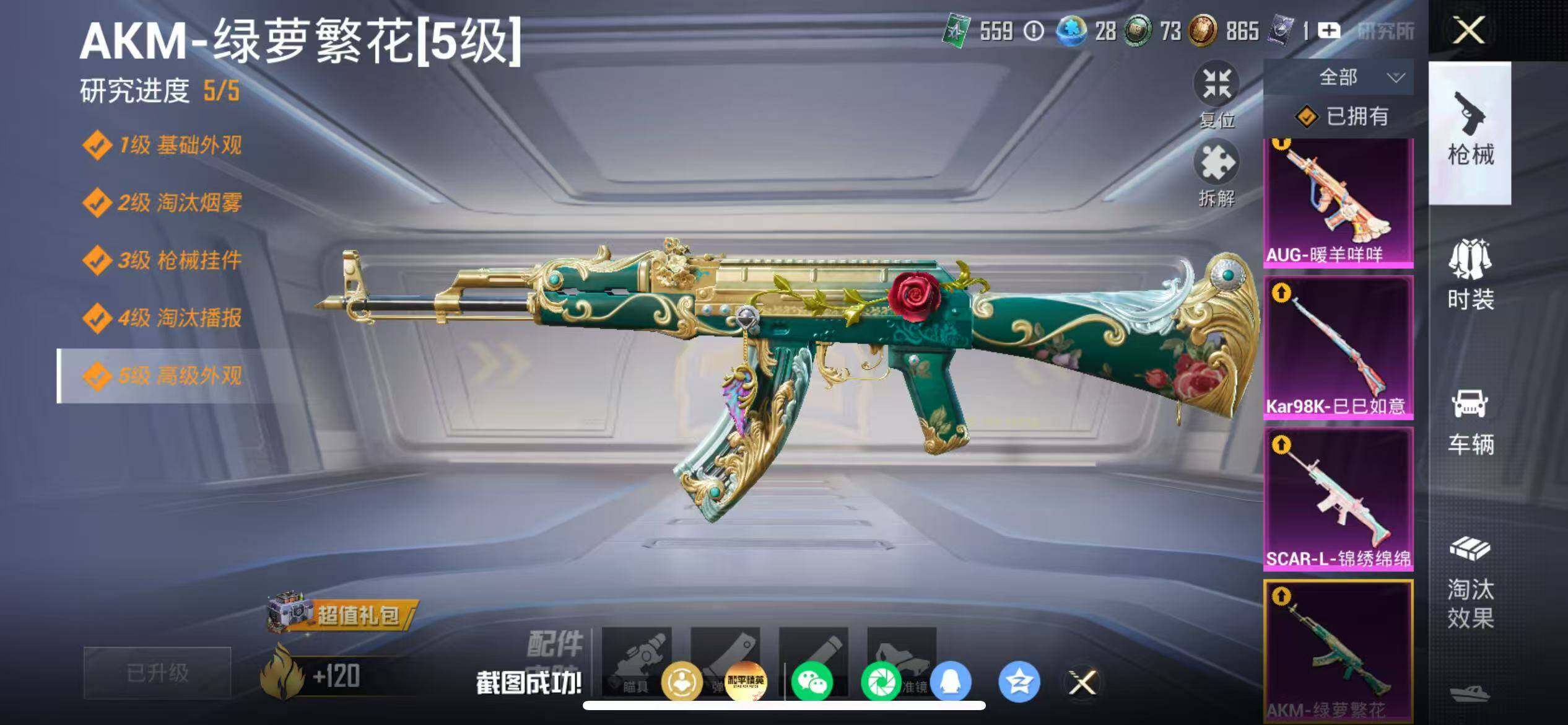 【粉色枪皮等级】:AKM-绿萝繁花(五级),SCAR-L-锦绣绵绵(五级