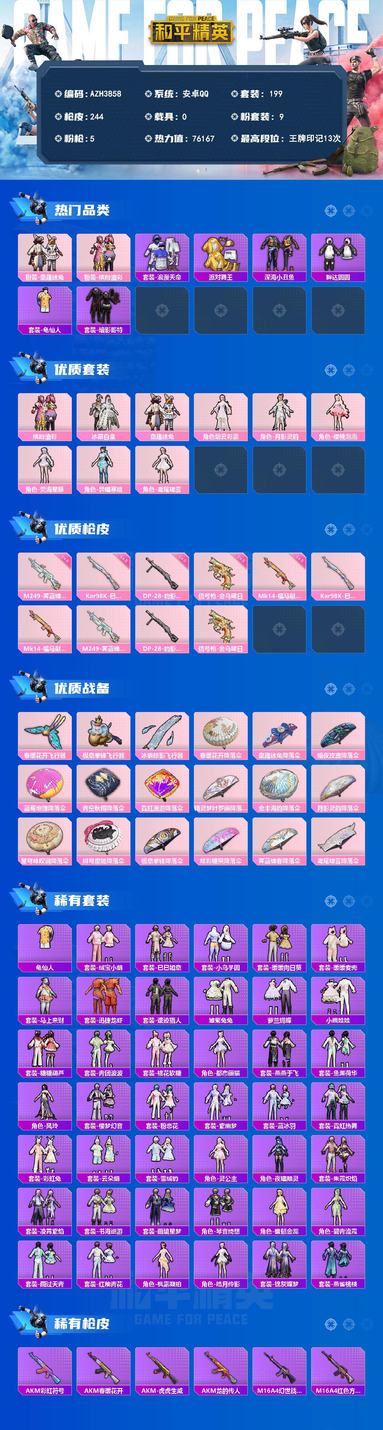【AZH3858】安卓手Q【童趣迷兔猪脸樱桃泡泡 暖暖麦兜胖达圆圆金靴子】9粉装-5特效枪-3粉色飞行器-76167热力值-13王牌印记-199套装-244枪皮