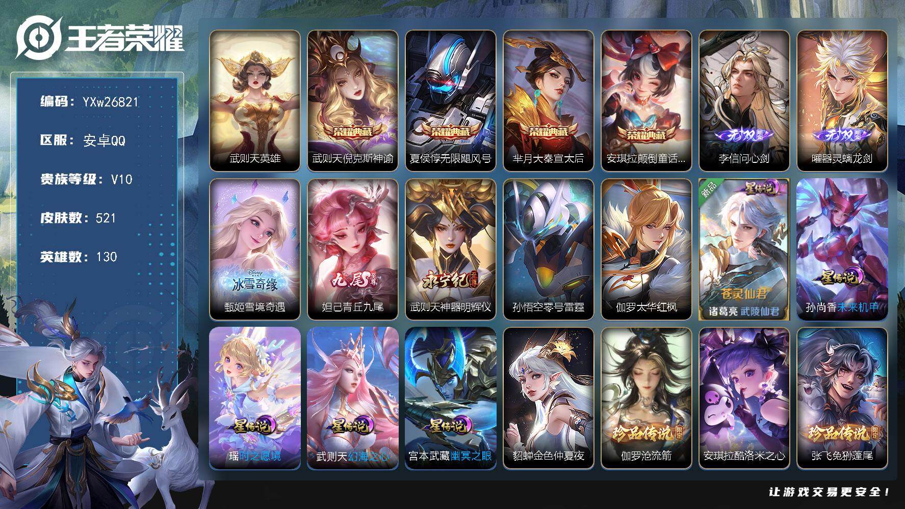 【高性价比v10·5典藏·5无双·5珍品·8星传说·59传说·2精品天幕·青丘九尾·柯南·紫瑶·苍灵仙君·太华红枫·凤鸣九霄天幕·灿若星河天幕·满蛇年限定·满龙年限定·神骥镇沧海·神骥鸣幻洲·神骥聚万邦·山海琳琅生·山海炽霜斩·祈雪灵祝·时雨天司·白虎志·无二次包过】YXw26821-安卓Q-130英雄-521皮肤-16王者印记-300铭文-贵族积分22w【贵族10