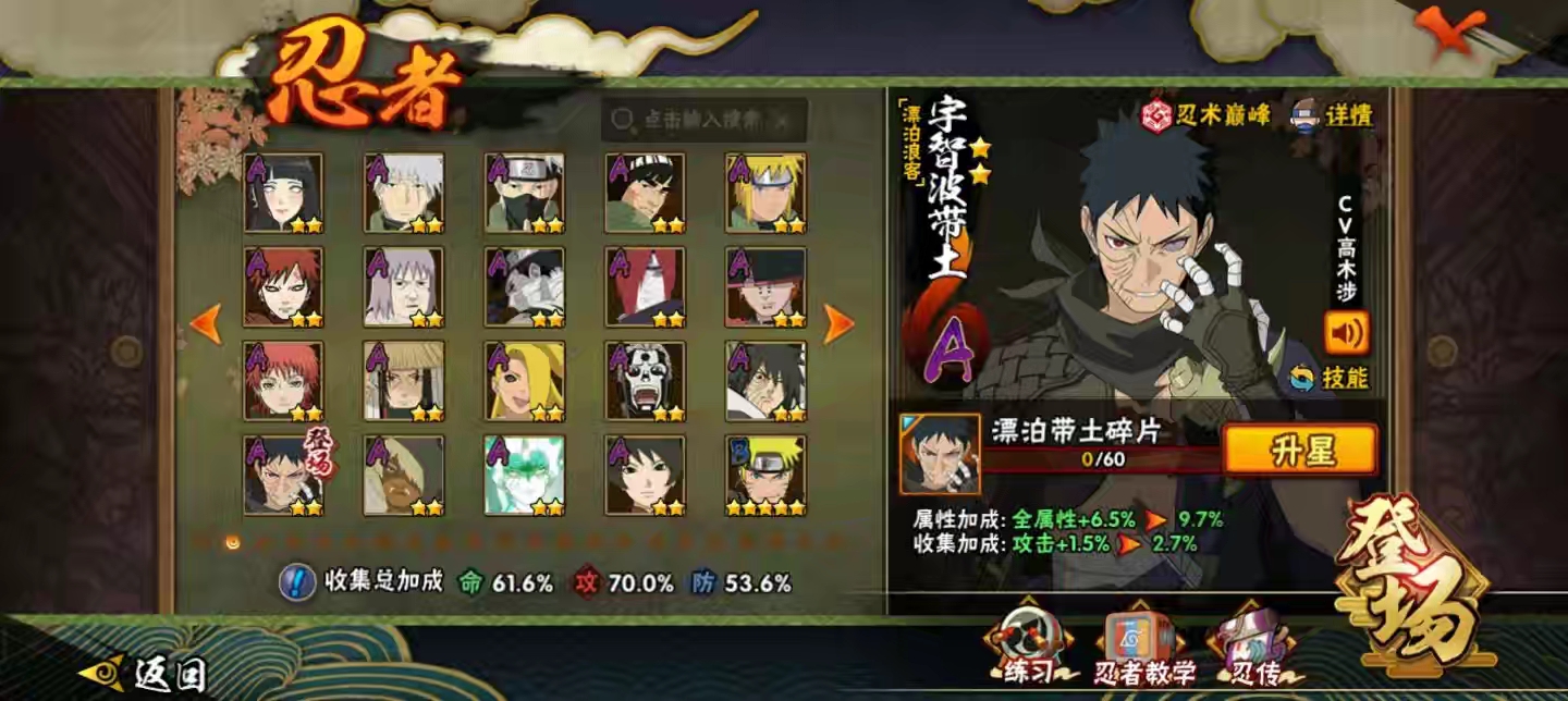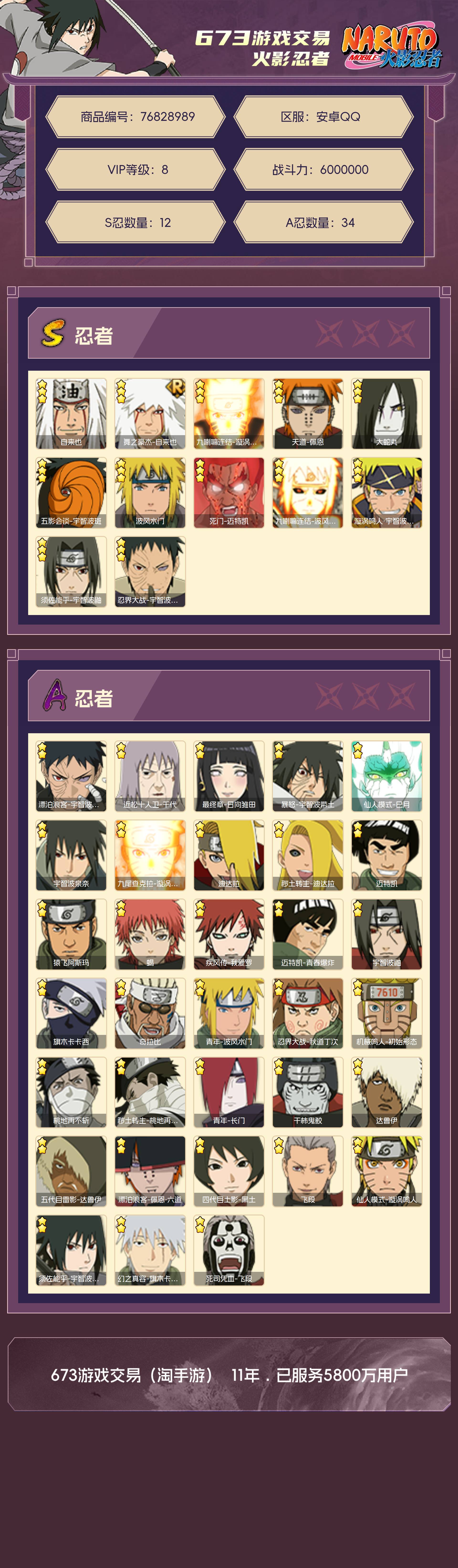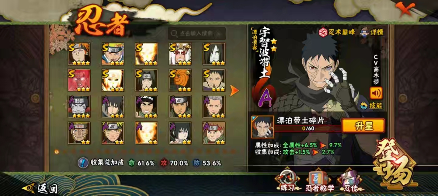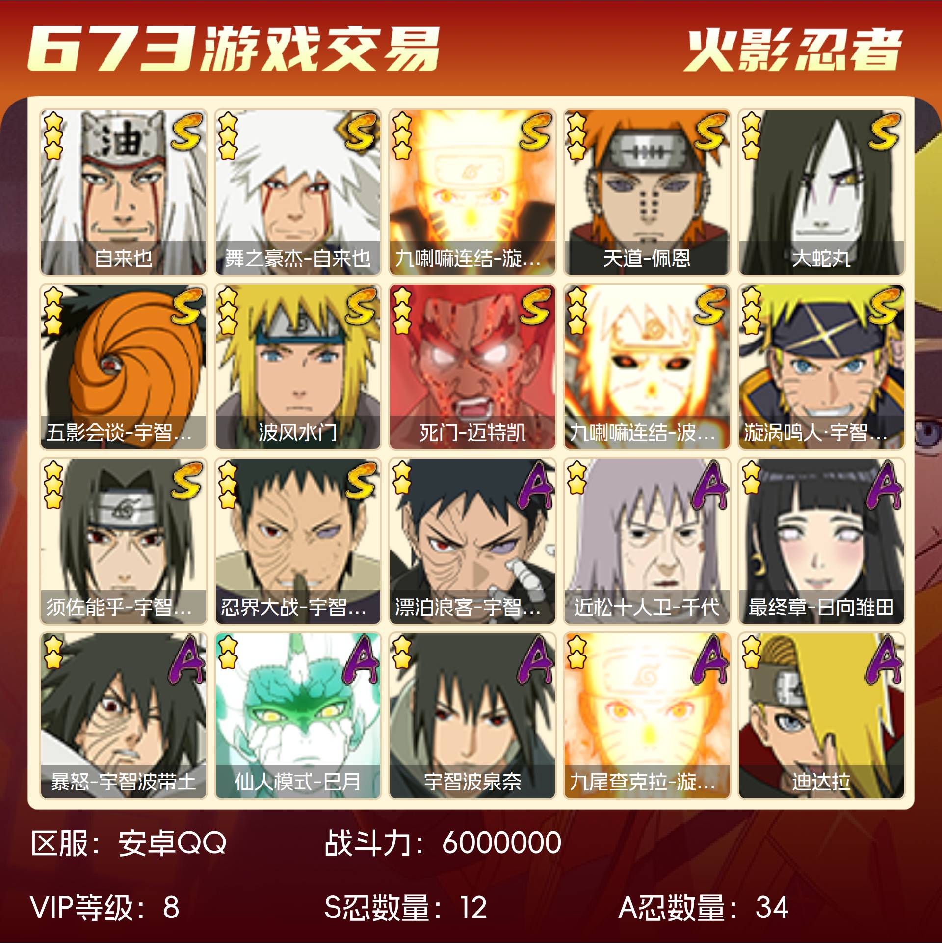 角色等级142 金币1000 战斗力6000000 S忍12 A忍34 5星S忍者10 8 段位影级