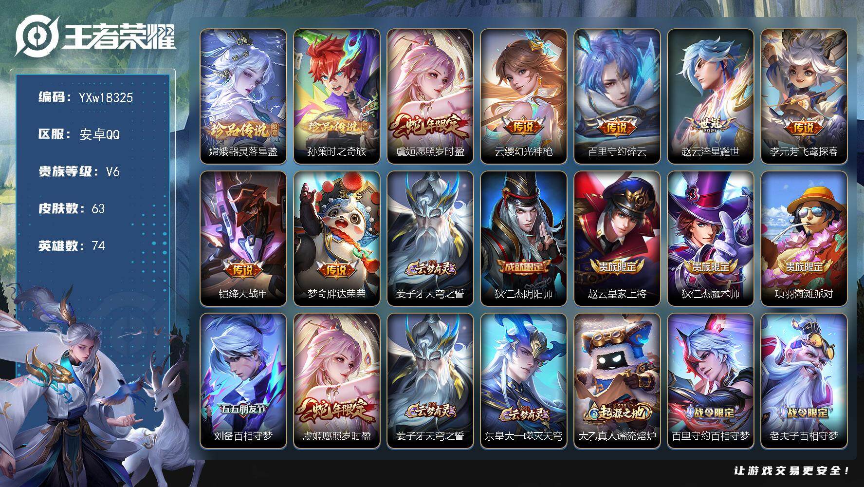 8248/【精品小号推荐·器灵落星盏·孙策时之奇旅·愿照岁时盈·碎云·淬星耀世·绛天战甲·雪境奇遇·可二次】YXw18325-安卓Q-74英雄-63皮肤-2王者印记-10铭文-贵族积分1w【贵族6】【2珍品·7传说·8按键】【因赛季更新游戏段付以上号为准!】