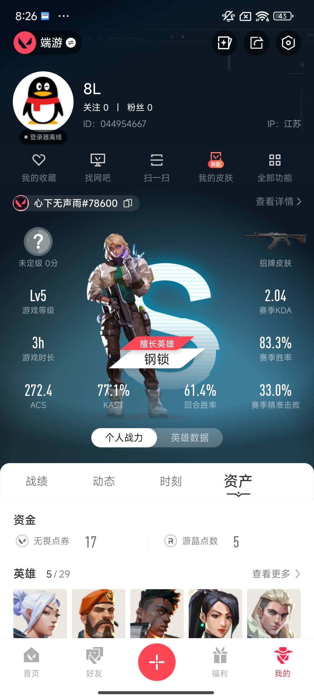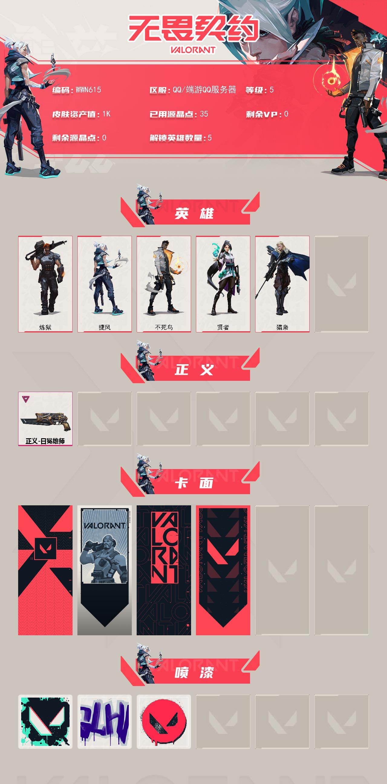 【WWN615】LV等级5/皮肤总价值1290/段位未定级/总皮肤数量1/枪皮数量1/具体详情请看图/炼狱/捷风/不死鸟/贤者/猎枭/正义-日冕雄师/代号红色 卡面/新兵报到 卡面/V契约 卡面/无畏契约 卡面/胜利属于无畏契约 喷漆/GLHF 喷漆/无畏契约 喷漆